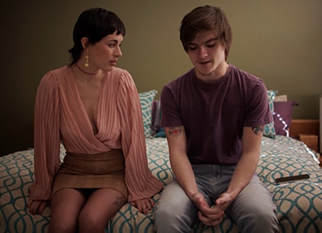 Tyler (Cruise) is standing at the bedroom door, watching his stepmother (Olive Glass) get dressed, his gaze riveted on her pantyhose. He knocks, and she turns to greet him, smiling: "Come in".